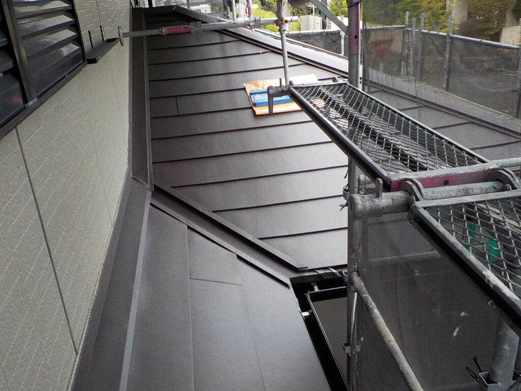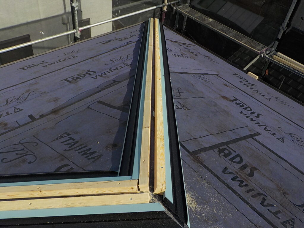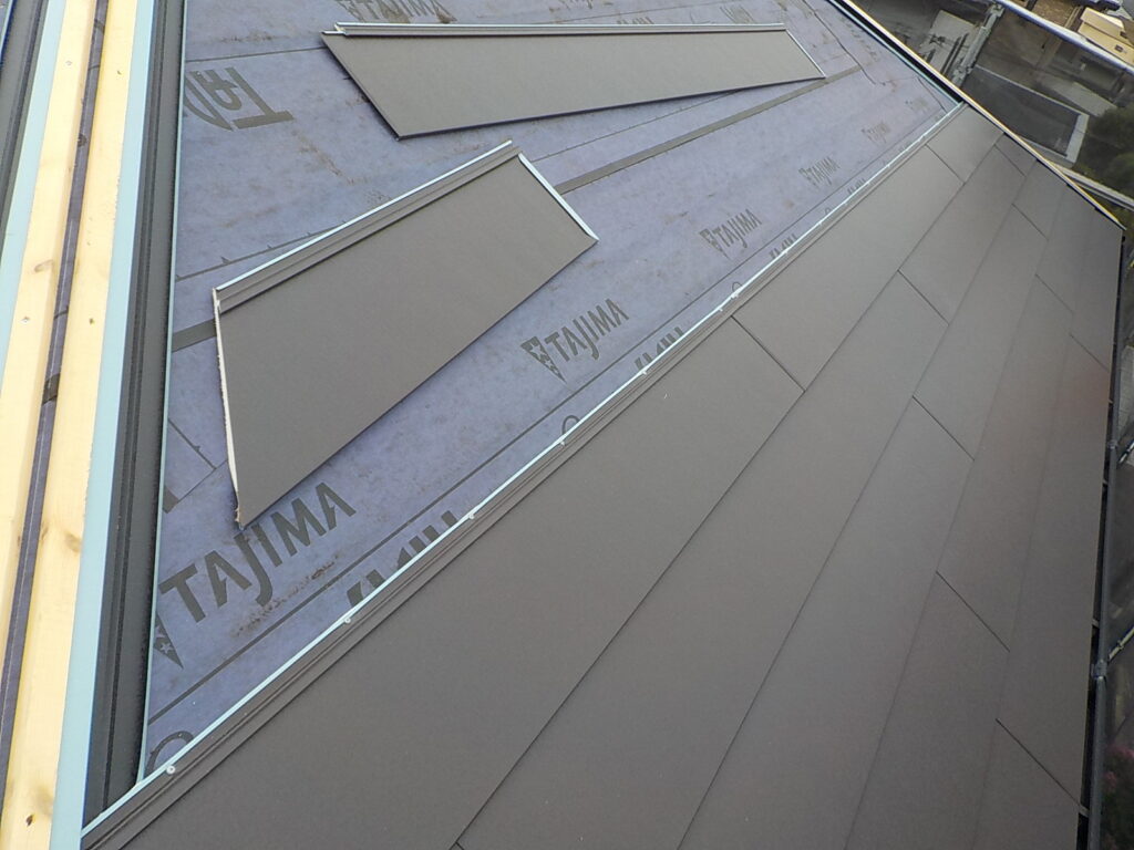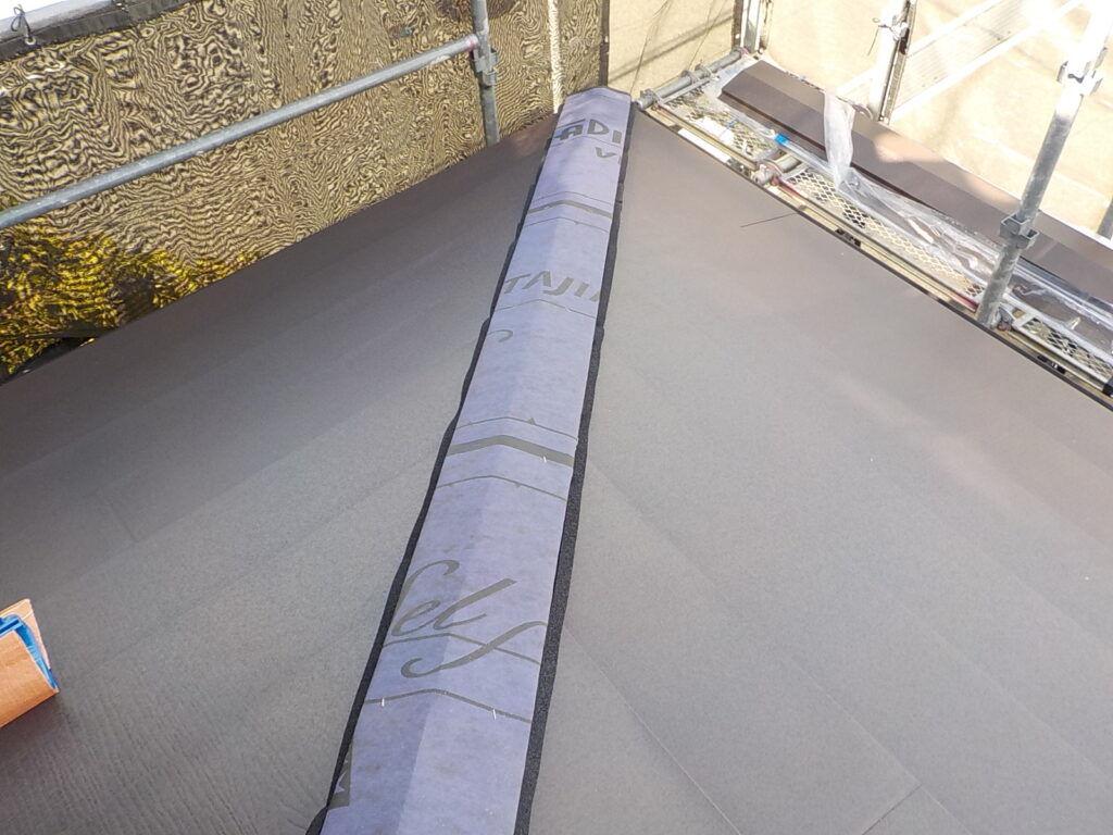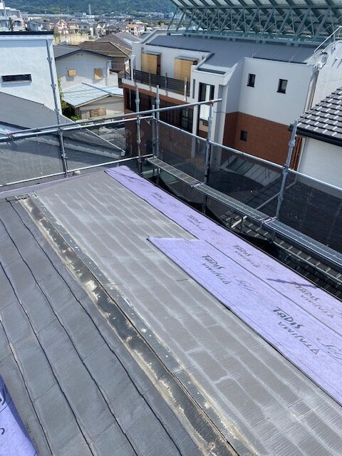 既存スレートの上に防水シート(ルーフィング)を施工し捨て水切りを取り付けて新しい材料を葺いていきます。